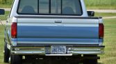 The body is finished in two-tone Oxford White (YZ) and Indigo Blue Metallic (KU) with blue pinstripes as well as chrome trim, Western-style mirrors, and bumpers. The bed is equipped with a drop-in liner and a tonneau cover, and additional equipment includes a hitch receiver.