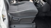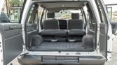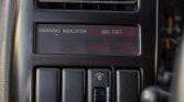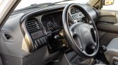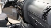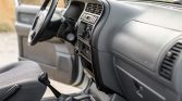 The cabin features front bucket seats and a folding rear bench upholstered in gray cloth with patterned inserts as well as matching carpets and rubber floor mats. Equipment includes air conditioning, cruise control, power aLessories, a digital clock, and an Isuzu AM/FM/cassette stereo. A trailer brake controller has been fitted to the right of the steering column.