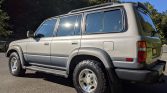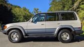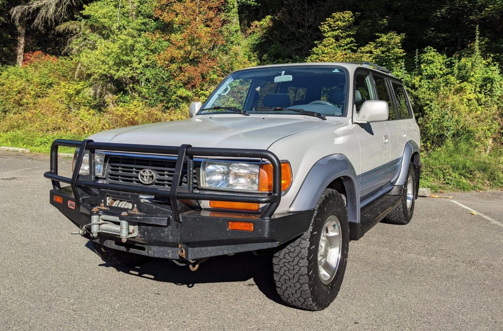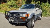 This 1996 Toyota Land Cruiser is finished in beige and gray over gray leather and is powered by a 4.5-liter inline-six mated to a four-speed automatic transmission, a dual-range transfer case, and optional front and rear locking differentials. Additional features include automatic headlights, an ARB front bumper, a Warn winch, 16″ alloy wheels, a sunroof, air conditioning, cruise control, and a Kenwood CD stereo.
