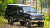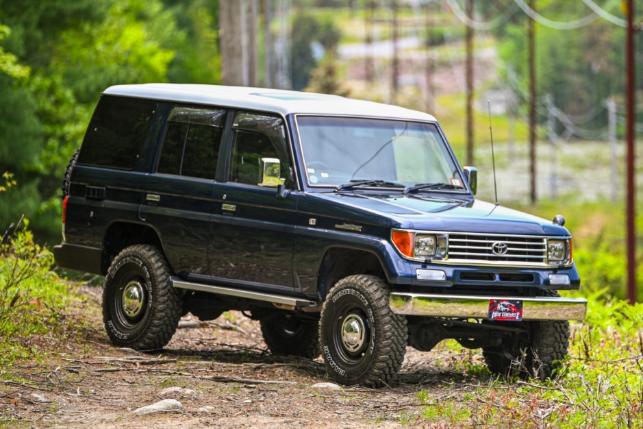 This 1996 Toyota Land Cruiser KZJ78 Prado EX is a right-hand-drive example that was built in January 1996 and imported to the United States from Japan in 2021. Finished in blue with a white roof over a gray interior, the truck is powered by a 3.0-liter turbodiesel inline-four paired with a four-speed automatic transmission and a two-speed transfer case. Features include aftermarket 16″ alloy wheels, a locking rear differential, aftermarket shocks and springs, a sunroof, air conditioning, and a touchscreen infotainment system. Recent work carried out reportedly consists of an oil change along with a replacement timing belt, fuel filter, and air filter.