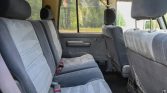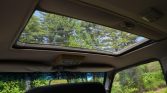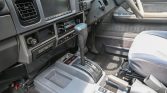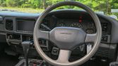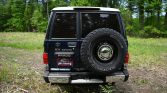 Aftermarket 16″ alloy wheels wear chrome caps and are mounted with 235/85 Renegade R7 M/T tires, and a matching spare is affixed to the rear ambulance-style doors. The truck features manually-locking front hubs and has been fitted with a lift kit with aftermarket shocks and springs.