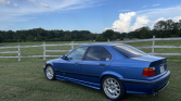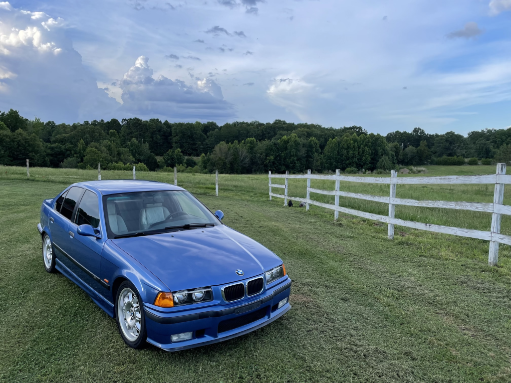 This 1997 BMW M3 sedan is finished in Estoril Blue Metallic over gray leather and powered by a 3.2-liter inline-six paired with a replacement five-speed manual transmission. The car was acquired by the seller in 2020, and subsequent work has reportedly included a transmission swap and replacement of the clutch components, fluids, and flex disc as well as installation of BC Racing adjustable coil-overs, a UUC Short Shift kit, Kassel Performance engine management software, and a Bluetooth-capable Continental-branded CD stereo. Additional equipment includes 17″ DS2 wheels, an electric sunroof, automatic climate control, tinted windows, and LED taillight bulbs.