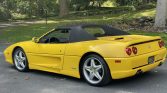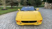 This 1997 Ferrari F355 Spider is finished in Giallo Modena over black leather and is powered by a 3.5-liter DOHC V8 paired with a gated six-speed manual transaxle and a limited-slip differential. Features include a black convertible soft top, a Tubi muffler, a Kenwood stereo, automatic climate control, power windows, Gothspeed heat shields, pop-up headlamps, fog lights, and 18″ five-spoke wheels.