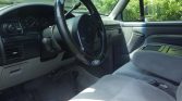 The cab features front and rear bench seats upholstered in gray cloth. Amenities include a fold-down center armrest with a console for the front bench seat, air conditioning, cruise control, an AM/FM/CD stereo, and power windows and door locks.