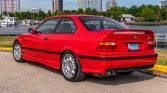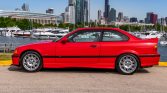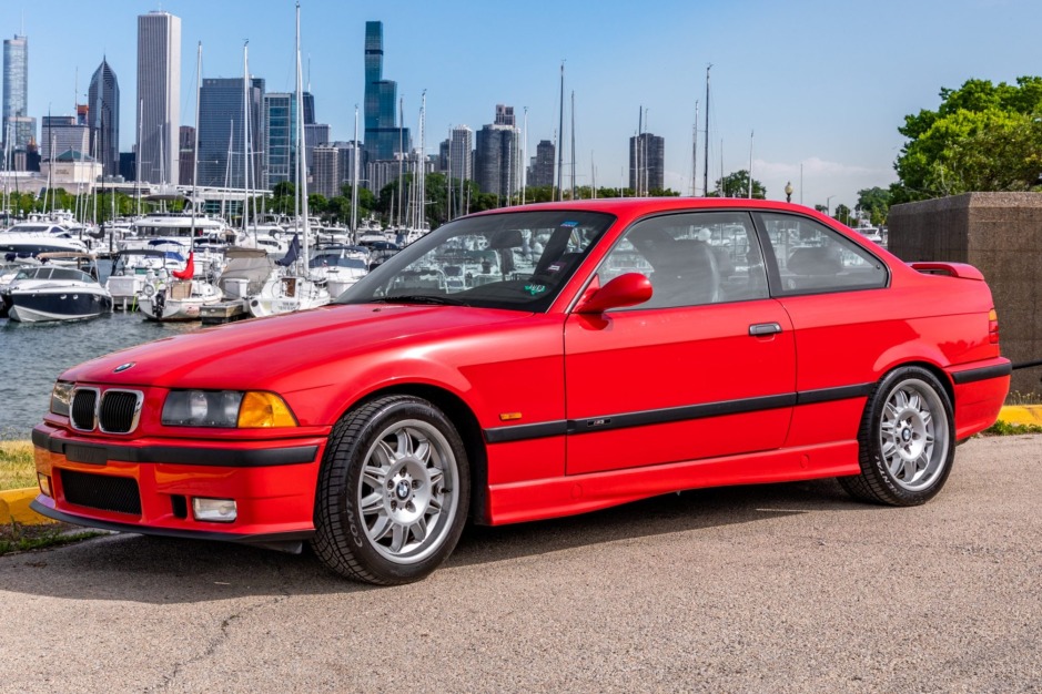 This 1998 BMW M3 coupe was purchased new by the seller from Momentum BMW of Houston, Texas, and relocated to Illinois in 2003. The car is finished in red over black Nappa leather and is powered by a 3.2-liter inline-six paired with a five-speed manual transmission and a limited-slip differential. Equipment includes fog lights, a rear spoiler, cruise control, a sunroof, heated Vader sport seats, automatic climate control, and a Harman Kardon audio system.