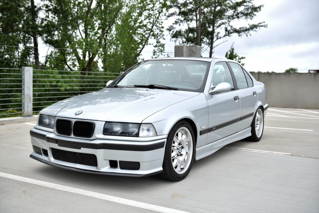 This 1998 BMW M3 sedan is finished in silver over grey leather and powered by a 3.2-liter inline-six mated to a five-speed manual transmission and a limited-slip differential. Factory equipment includes a power-operated sunroof, heated sport seats, and dual-zone automatic climate control, while modifications consist of an M50 intake manifold, aluminum radiator, K&N conical air intake, aftermarket exhaust system, Bilstein strut assemblies, and aftermarket lowering springs and sway bars. The car was first registered in Pennsylvania and later relocated to Georgia where it was acquired by the seller in 2012. Service in 2021 included a cooling system overhaul and replacement of the oil pan gasket, air intake hose, lower control arms, and brake switch.