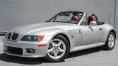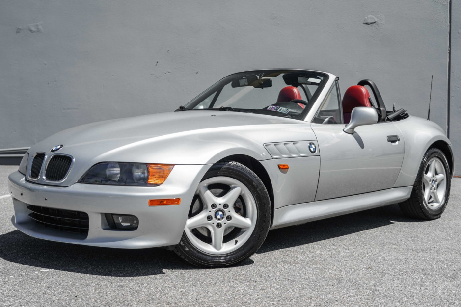 This 1999 BMW Z3 is finished in Arctic Silver Metallic over Tanin Red leather, and it is powered by a 2.8-liter inline-six paired with a five-speed manual transmission and a limited-slip differential. Equipment includes a power-retractable black soft top, front fog lights, heated and power-adjustable seats, cruise control, air conditioning, and a BMW Business CD stereo with Harman Kardon audio.