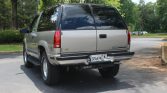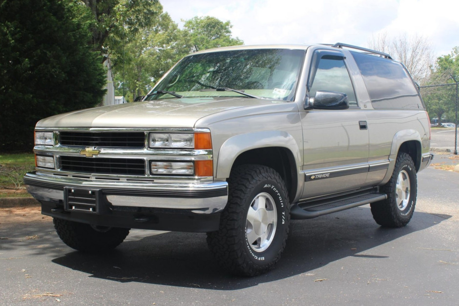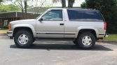 This 1999 Chevrolet Tahoe LT is a two-door example finished in Light Pewter Metallic over tan leather and powered by a 5.7-liter Vortec V8 linked with a four-speed automatic transmission and a dual-range transfer case. Additional equipment includes the Z71 Off-Road Package, air conditioning, an AM/FM cassette stereo with a CD player, a roof rack, a receiver hitch, wheel arch flares, and swing-out rear doors.