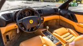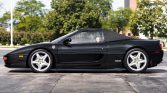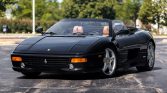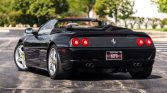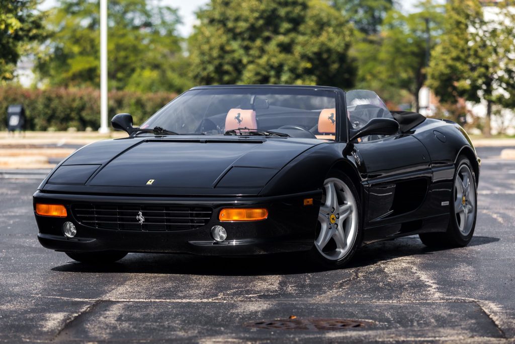 This 1999 Ferrari F355 Spider is powered by a 3.5-liter DOHC V8 paired with a gated six-speed manual transaxle and a limited-slip differential. The car is finished in black over tan leather and features a black soft top, a Challenge-style rear grille, Veglia Borletti instrumentation, a 599-sourced stereo w/Bluetooth connectivity, 18″ alloy wheels, pop-up headlights, and power windows.