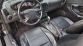 The cabin features power-adjustable seats upholstered in black leather along with a matching dashboard, door panels, and carpets as well as Porsche-logo embroidered floor mats. Amenities include automatic climate control, central locking, cruise control, power windows, an onboard computer, aluminum door sills, and an aftermarket Alpine stereo with a remote CD changer.