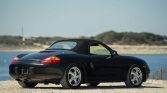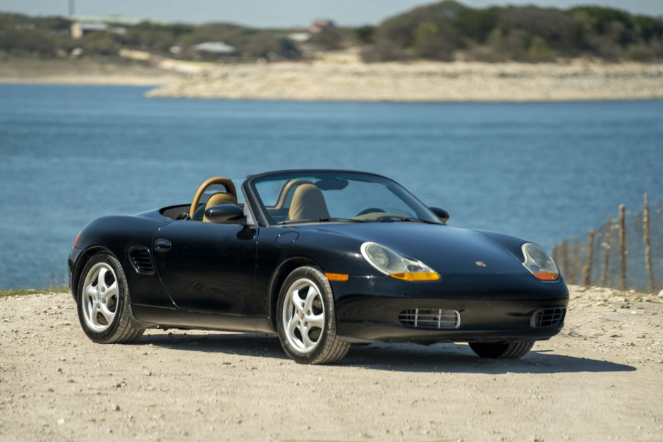 This 1999 Porsche Boxster is finished in black over beige leather and is powered by a 2.5-liter flat-six paired with a five-speed manual transaxle. Equipment includes a power-operated black soft top, a Blaupunkt CD stereo, cruise control, automatic climate control, and 17″ alloy wheels. Maintenance since 2019 included replacement of cooling system and front suspension components, and an oil change service was completed in preparation for sale.