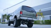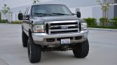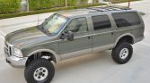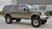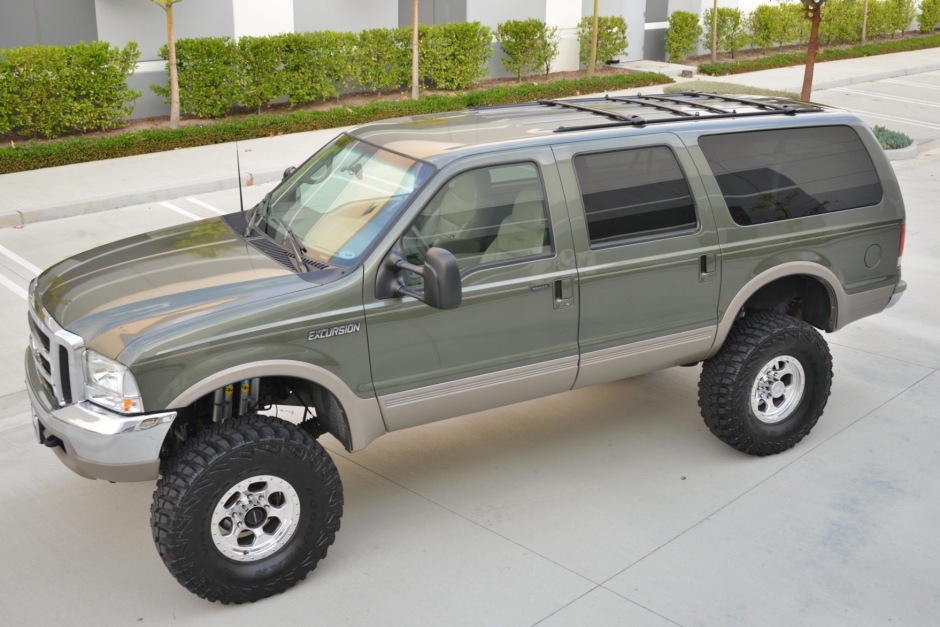 This 2000 Ford Excursion is finished in Estate Green over Medium Parchment leather and is powered by a 7.3-liter Power Stroke turbodiesel V8 paired with a four-speed automatic transmission and a dual-range transfer case. The car was purchased new by the seller from Ford West in Bellflower, California, and equipment includes a 3.73:1 limited-slip rear differential, a transfer case skid plate, telescopic heated tow mirrors, heated seats, and a CD changer. Modifications consist of a 6″ suspension lift, an aftermarket exhaust system, a cold-air intake, AMP power-folding side steps, and Robby Gordon aluminum wheels mounted with Goodyear Wrangler MT/R tires. The truck now shows 88k miles, and the seller states that the oil was changed at 85k miles and the transmission fluid was serviced at 60k miles.