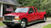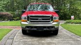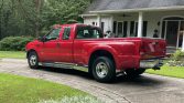 This 2000 Ford F-350 Super Duty XLT is a SuperCab 4×2 dually long-bed example finished in red over gray cloth and powered by a 6.8-liter V10 paired with a four-speed automatic transmission. Additional equipment includes a receiver hitch, air conditioning, cruise control, an AM/FM cassette stereo, chrome side steps, roof clearance lights, and 16″ polished aluminum wheels. The truck was first delivered to Gene Evans Ford in Union City, Georgia, and reportedly remained with its original owner…