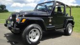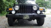This 2000 Jeep Wrangler Sahara is finished in black over Dark Green and Camel cloth upholstery and is powered by a 4.0-liter inline-six linked with a three-speed automatic transmission and a dual-range Command-Trac transfer case. Features include a tan Quadratec soft top, full metal doors, 15″ Canyon aluminum wheels, a Rough Country steering stabilizer, fog lights, air conditioning, a fold-and-tumble rear seat, power steering, high-back front bucket seats, an AM/FM/CD stereo, and a roll bar.