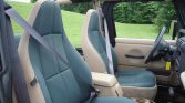 The cabin features high-back front bucket seats upholstered in Dark Green and Camel cloth with color-coordinated door panels and carpets. Amenities include a fold-and-tumble rear seat, a roll bar, a mini-floor console with a cup holder, air conditioning, an AM/FM/CD stereo, and a locking glovebox.