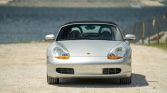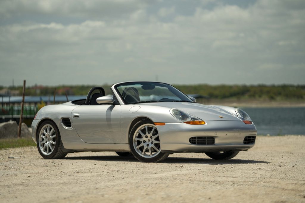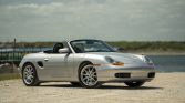 This 2000 Porsche Boxster is finished in Arctic Silver Metallic over black leather and powered by a 2.7-liter flat-six paired with a five-speed manual transaxle. Equipment includes a black soft top, 18″ Sport Design wheels, automatic climate control, cruise control, a wind deflector, stainless-steel and aluminum trim accents, and Porsche Communication Management (PCM) with navigation.