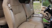 The cabin is upholstered in tan leather with a matching dashboard, carpets, and door panels. Equipment includes a fold-down center console, power windows and locks, air conditioning, power-adjustable and heated front seats, cruise control, an AM/FM stereo with cassette and CD players, an aftermarket backup camera, and an under-dash Draw-Tite trailer brake controller.