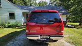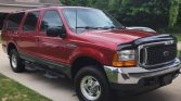 This 2001 Ford Excursion XLT is powered by a 7.3-liter Power Stroke turbodiesel V8 linked with a four-speed automatic transmission and a dual-range transfer case. The truck is finished in Toreador Red Metallic over Medium Graphite cloth, and features include 16″ five-spoke alloy wheels, Mile Marker manual locking front hubs, cross-drilled and slotted brake rotors, KYX running boards, roof rails, an aftermarket remote start system, a backup camera, air conditioning, Pioneer door speakers, and an Alpine touchscreen head unit with wireless Apple CarPlay and Android Auto.