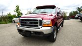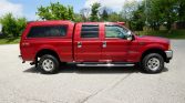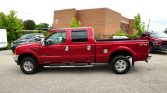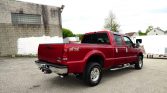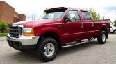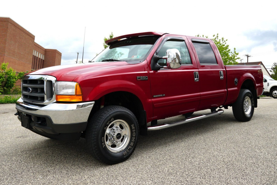 This 2001 Ford F-250 Super Duty Lariat crew cab is finished in red over tan leather and is powered by a 7.3-liter turbodiesel V8 paired with a four-speed automatic transmission and a dual-range transfer case. Features include a factory off-road package, chrome tubular side steps, telescoping power tow mirrors, roof clearance lights, power aLessories, air conditioning, and a sliding rear window.