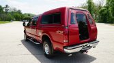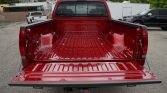 The truck is finished in Toreador Red Clearcoat Metallic (FL/M6758) and features fog lamps, roof clearance lamps, an ARE bed cap with a rear door, power telescoping tow mirrors, window vent shades and a chrome fuel door, bumpers, door handles, mirror caps, and tubular side steps.
