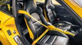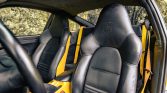 The cabin features heated and power-adjustable sports seats upholstered in black leather with embossed headrests and yellow hard-back shells. Leather and carbon-fiber accents are present on the dashboard and door panels, and the center console is finished in yellow. Additional equipment includes automatic climate control, cruise control, power accessories, yellow seat belts, embroidered floor mats, navigation, a cassette-tape player, a remote six-disc CD changer, and Porsche Communication Management (PCM).
