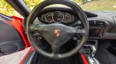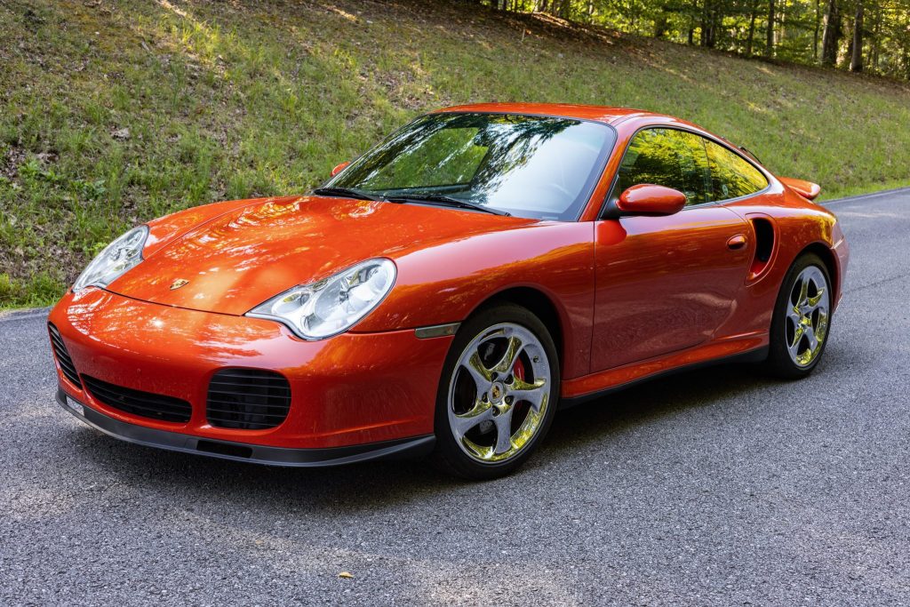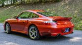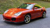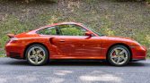 This 2001 Porsche 911 Turbo coupe is finished in Zanzibar Red over black full leather and was initially collected via tourist delivery. Equipment includes a speed-activated rear spoiler, a sunroof, xenon headlights, chrome-finished 18″ Turbo Twist wheels, Digital Sound Processing, and a Kenwood touchscreen head unit with smartphone connectivity. Power is provided by a twin-turbocharged 3.6-liter Mezger flat-six linked with a five-speed Tiptronic automatic transaxle.