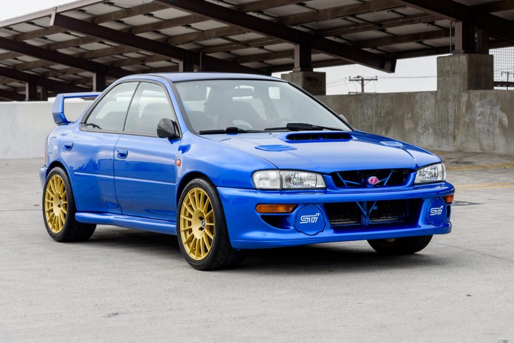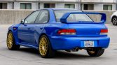 The car was fitted with an ABW Motorsports 60mm 22B-style body kit and a JDM-style flat fuel door before it was repainted in its current blue under the seller’s ownership. Features include a rear wing with an integrated third brake light, S201-style mirrors, side marker lamps, Kouki fog lights with body-color STI caps, and a pink Impreza grille badge. The Carfax report notes a July 2014 accident resulting in the car getting towed, although no additional information is available.