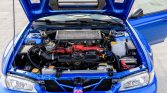 The turbocharged 2.0-liter EJ207 flat-four was reportedly sourced from a 2004 JDM Version 8 WRX STI and was installed under the seller’s ownership along with a new timing belt, water pump, spark plugs, oil pickup tube, thermostat, and iWire harness. Modifications include a VF48 turbocharger, a HyperGate 45mm external wastegate, an AEM three-bar MAP sensor, a Koyo radiator, and Group N engine mounts. A COBB Tuning flex-fuel kit is fitted, and the car was reportedly tuned by Yimi Sport Tuning of Valencia, California, to run on E85 and 91-octane fuels.