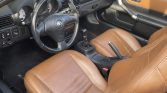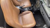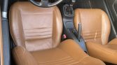 The cabin features manually-adjustable seats upholstered in tan leather with matching door panel inserts. Branded floor mats line the footwells, and amenities include air conditioning, power windows and door locks, a leather-wrapped shift knob, aluminum pedals, and a locking glove box.