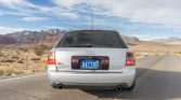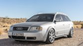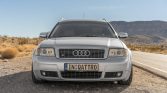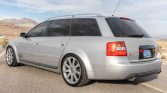 This 2002 Audi S6 Avant is powered by a 4.2-liter V8 mated to a five-speed Tiptronic automatic transmission and Quattro all-wheel drive, and it is finished in silver over gray leather and Alcantara upholstery. Equipment includes 18″ RS6 wheels, H&R coilovers, a sunroof, dual-zone automatic climate control, a factory CD/cassette stereo, and heated seats. Service performed since 2020 is said to have involved replacement of the timing belt, water pump, fuel pump, and fuel filter.