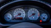 The M-branded steering wheel features tri-color stitching, a leather wrap, and Imola Red aLents, and it frames a 170-mph speedometer, a tachometer with an 8k-rpm redline, and auxiliary gauges. An analog clock, ambient temperature gauge, and oil temperature gauge are located in the center stack beneath the climate controls. The digital odometer indicates just under 4,500 miles.
