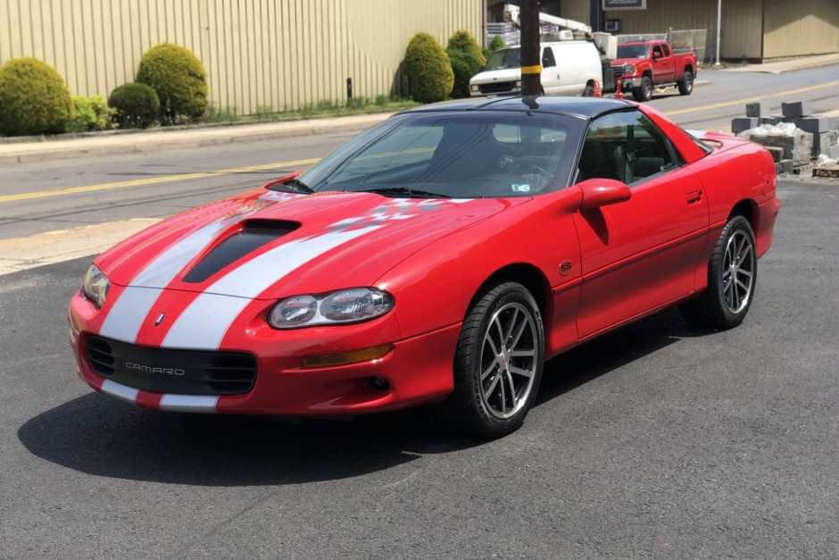 This 2002 Chevrolet Camaro Z28 SS coupe 35th Anniversary edition is one of 3,369 examples produced for the model year and was acquired new by the current owner from Klick-Lewis Chevrolet in Palmyra, Pennsylvania. The car is finished in Bright Rally Red over two-tone Ebony and gray leather and is powered by a 5.7-liter LS1 V8 linked with a six-speed manual transmission and a limited-slip differential. Additional equipment includes the SS Performance and Appearance package, the Preferred Equipment Group, 35th Anniversary badging, silver hood and hatch graphics, removable T-tops, and 17″ aluminum wheels.