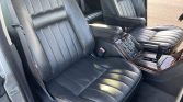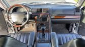 The cabin features seats and armrests upholstered in black leather, which are joined by a matching dashboard and door panels along with burl wood accents on the doors, dash, center console, and steering wheel. Amenities include automatic climate control, navigation, an analog clock, an AM/FM cassette stereo, heated and power-adjustable front seats, and power windows and locks.