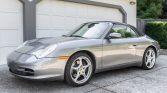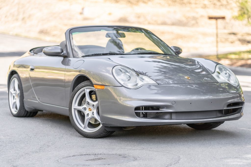This 2002 Porsche 911 Carrera cabriolet was purchased new by the seller from Negherbon Porsche in Oakland, California, and is finished in Seal Grey Metallic over Graphite Grey leather. Power is provided by a 3.6L flat-six paired with a six-speed manual transaxle, and additional equipment includes a power-operated black soft top, a body-color removable hard top, a speed-activated rear spoiler, Porsche Stability Management, automatic climate control, a Porsche CDR-220 stereo, heated front seats, and 18″ Carrera alloy wheels. An LN Engineering IMS bearing kit was installed and the clutch was replaced in July 2014, and the car now has 58k miles.