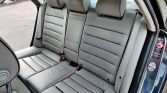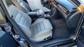 The cabin features front and rear heated seats trimmed in silver Nappa leather with black piping, and burl wood trim accents the black dashboard, center console, and door panels. Amenities include Bose audio, dual-zone automatic climate control, cruise control, power accessories, and a factory CD/cassette stereo. This example was optioned with the Warm Weather Package which added a powered rear window shade, rear passenger sunshades, and a solar panel on the sunroof that powers a cooling fan when parked.