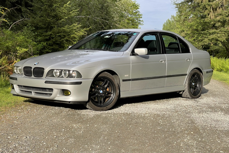 This 2003 BMW 540i M Sport is powered by a 4.4-liter V8 paired with a six-speed manual transmission and is finished in Titanium Silver Metallic over black leather.Equipment includes a moonroof, M-Technic II suspension, 18″ M-Parallel wheels, navigation, fold-down rear seats, xenon headlights, and power-adjustable front sport seats, while modifications consist of a short-shift kit, a differential with a 3.15 axle ratio, European-specification xenon headlights, yellow fog light lenses, black grilles, and cosmetic dashboard upgrades including M5-style…