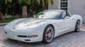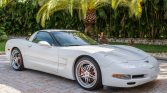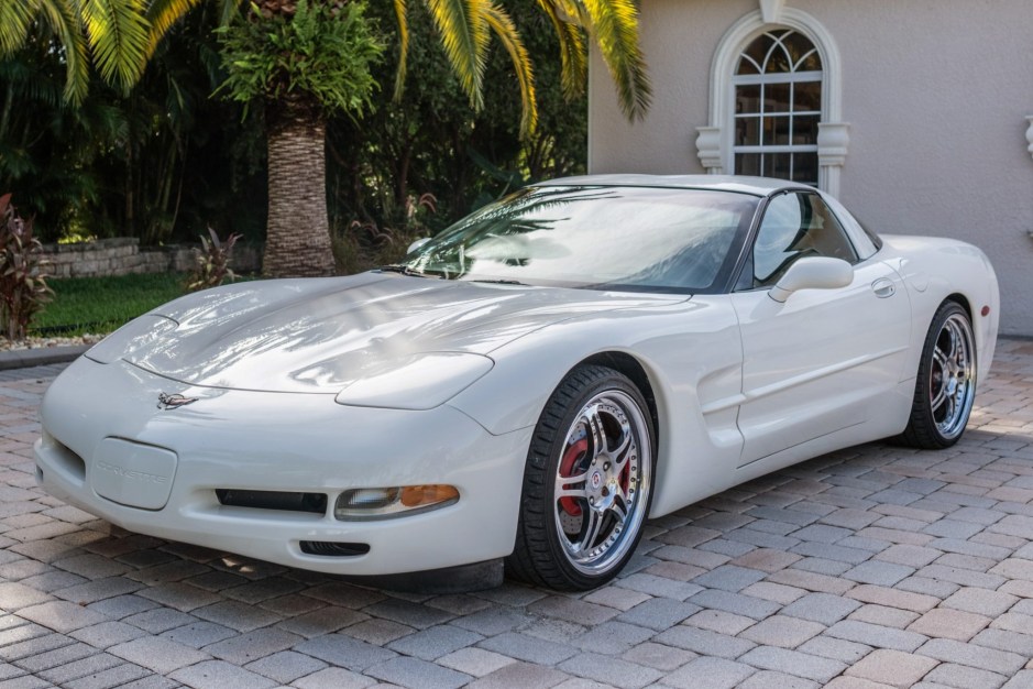 …This 2003 Chevrolet Corvette coupe is powered by a 5.7-liter LS1 V8 paired with a six-speed manual gearbox and is finished in Speedway White over Light Gray leather. The car has been fitted with staggered-diameter HRE wheels, lowering springs, a K&N air intake, and an aftermarket exhaust system. Additional features include a limited-slip differential, a removable body-color roof panel, power-adjustable seats, a head-up display, dual-zone automatic climate control, an Alpine CD stereo, an Audison amplifier, and cruise control.
