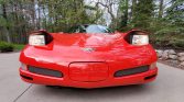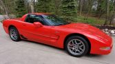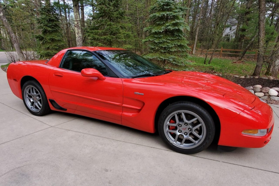 This 2003 Chevrolet Corvette Z06 is finished in Torch Red over black leather and is powered by a 5.7-liter LS6 V8 paired with a six-speed manual transaxle and a limited-slip differential. Equipment includes staggered-diameter wheels, brake cooling ducts, power aLessories, a head-up display, dual-zone automatic climate control, and Bose audio. The alternator and the serpentine belt were reportedly replaced in 2019.