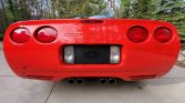 The C5 Z06 was distinguished by a fixed roof, thinner glass, and reduced sound deadening material to save weight. The fiberglass body of this example is finished in Torch Red (70U), and exterior details include bodyside moldings, pop-up headlamps, 50th anniversary and Z06 badging, rear brake vents, and quad exhaust outlets.