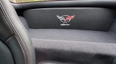 The interior is trimmed in black leather with matching door panels and carpets. The headrests are embroidered with the Z06 logo, and Corvette-branded floor mats line the footwells. Additional equipment includes cruise control, a head-up display, dual-zone automatic climate control, an AM/FM/CD stereo with Bose speakers, and a power-adjustable driver seat with position memory.