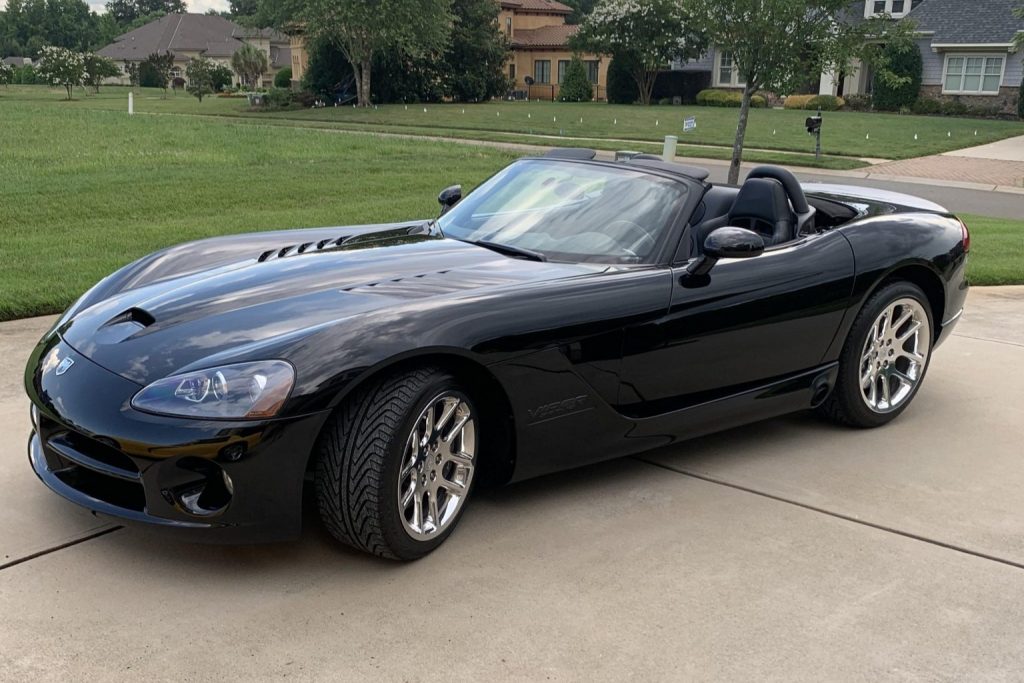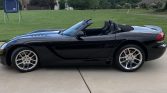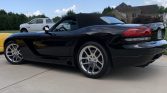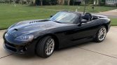 Introduced for the 2003 model year, the third-generation Viper was initially only offered as a roadster. This example is painted Viper Black Clear Coat and equipped with a black soft top, a hood scoop and louvers, HID headlights, fog lights, side-exit exhaust outlets, and a rear diffuser. The Carfax report shows no history of accidents or other damage, and the seller notes blemishes on the rear deck lid and bumper.