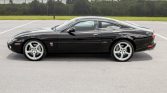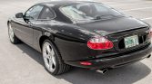 The car is finished in Ebony (1807) and features xenon headlights with washers, fog lights, XKR-specific hood vents, R badging, a power antenna, rear parking sensors, dual exhaust outlets, and a decklid spoiler.