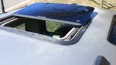 The truck is finished in White Gold and features dual electric sunroofs, alpine windows, heated side mirrors, fog lights, auxiliary driving lights, a factory brush bar, rear parking sensors, and a receiver hitch. The factory black plastic wheel arch covers and front mudguards were removed under previous ownership. The branded spare wheel cover displays the dealership where the vehicle was serviced during its time in Italy.