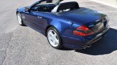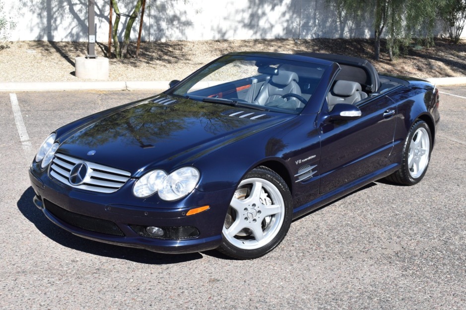 This 2003 Mercedes-Benz SL55 AMG is powered by a supercharged 5.4-liter V8 paired with a five-speed automatic transmission, and it is finished in Capri Blue Metallic over Anthracite leather. Equipment includes 18″ AMG five-spoke alloy wheels, a power-retractable hardtop, a panoramic glass roof, bi-xenon headlights, Parktronic, Keyless Go, proximity-sensing cruise control, heated and ventilated seats, a Bose sound system, and COMAND infotainment.