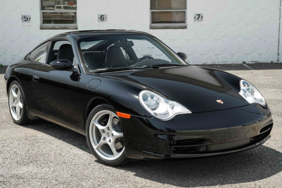This 2003 Porsche 911 Carrera is finished in black over black leather and is powered by a 3.6-liter flat-six paired with a six-speed manual transaxle. Equipment includes xenon headlights, 18″ Carrera wheels, a Porsche Sport Exhaust System, a sunroof, automatic climate control, and a Hi-Fi sound system. The oil was changed in preparation for the sale.