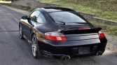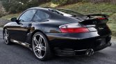 The 996 Turbo features side air intakes, revised front and rear bumpers, and wider rear bodywork in comparison to the contemporary 996 Carrera. This example is finished in Black (L041) and features a speed-activated rear spoiler, a rear window wiper, xenon headlamps with washers, fog lights, and stainless steel exhaust outlets.
