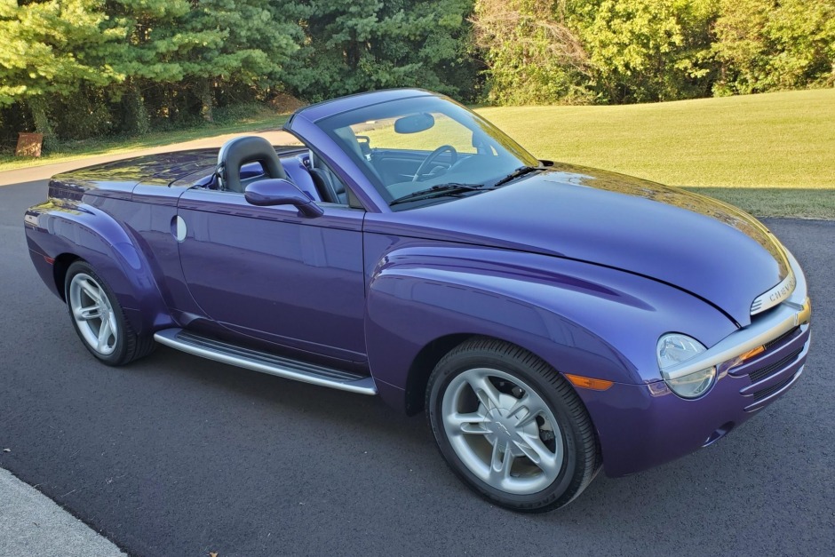 The SSR features styling inspired from the post-war Chevrolet Advance Design family of trucks and is built on a modified version of the GMT360 platform that is shared with the contemporary TrailBlazer SUV. This example is finished in purple and features a power-operated retractable hardtop, a removable body-colored tonneau cover, fog lights, integrated running boards, a receiver hitch, and a dual-outlet exhaust system.