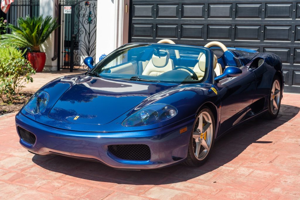 This 2004 Ferrari 360 Spider is finished in Tour de France Blue over a Creme leather interior and is powered by a mid-mounted 3.6-liter V8 paired with a six-speed sequential transaxle. Equipment includes a blue soft top, power-adjustable Daytona-style seats, automatic climate control, a Kenwood stereo, and 18” alloy wheels. The car was purchased new in California and remained in the state through its acquisition by the seller in 2014.