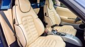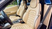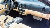 The power-adjustable Daytona-style seats feature Ferrari logos embossed in the headrests and are upholstered in Creme leather that extends to the dashboard, door panels, and rear trim. Amenities include automatic climate control, a Kenwood DVD receiver connected to a rear-view camera, and aluminum pedal pads.