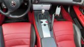 The cabin features red and black leather upholstery along with black carpeting and trim. Equipment includes aluminum pedals, air conditioning, cruise control, power windows and door locks, an aftermarket Alpine stereo head unit, an aftermarket amplifier, and a trunk-mounted JL Audio subwoofer. The trunk carpeting, spare tire, and factory tools were removed to facilitate the installation and are included in the sale.